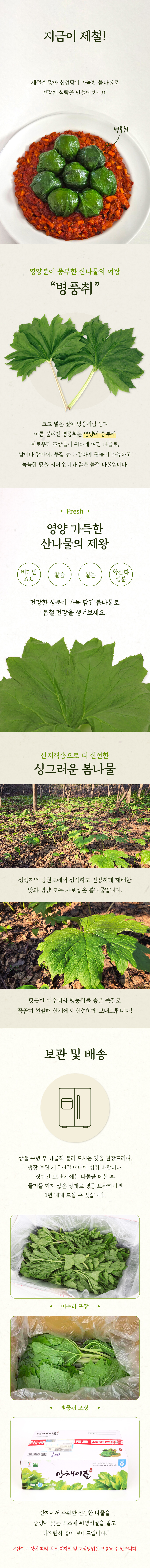 수령 후 즉시 사용요망, 즉시 사용이 어려울 경우 박스를 열어 나물을 뒤집어 열기를 빼 낸뒤 냉장보관