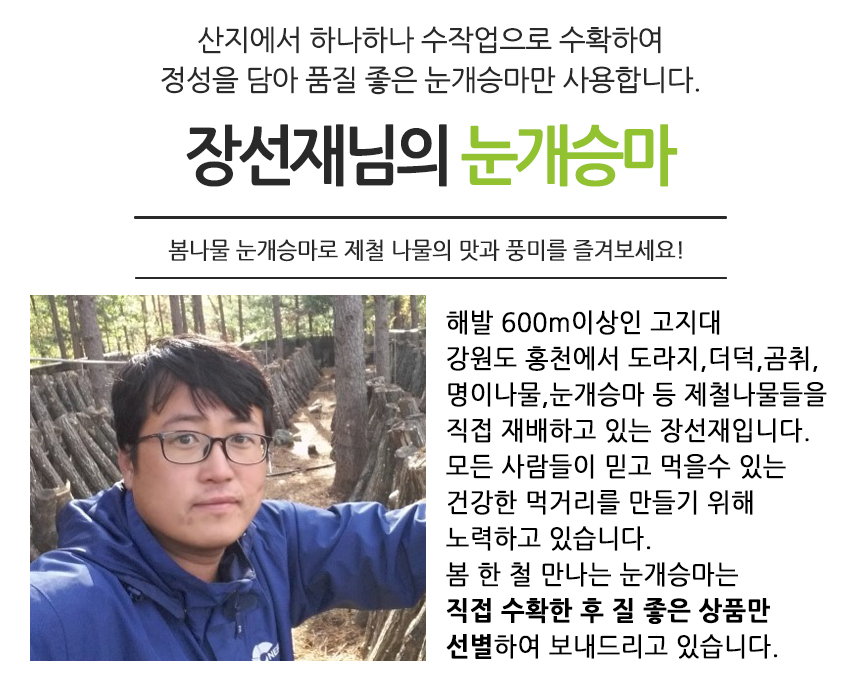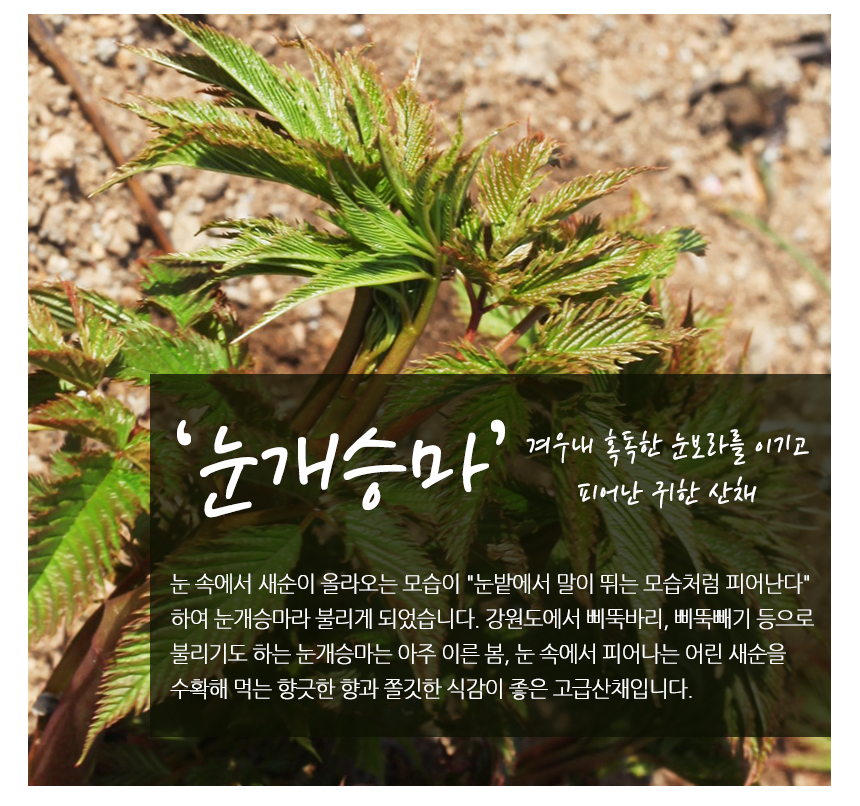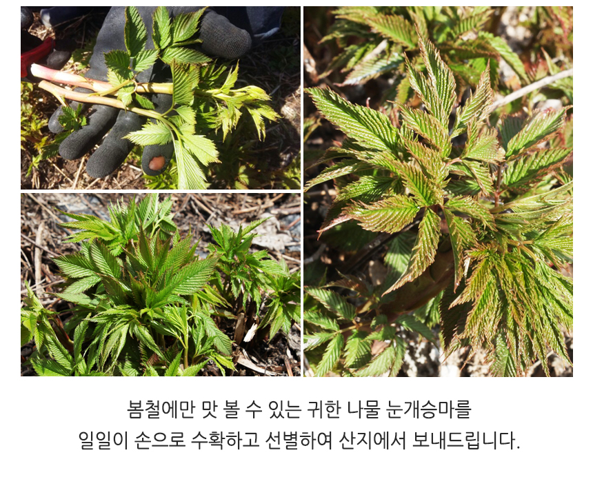 - 강원도 홍천 청정지역에서 자란 맛있는 눈개승마 / 해발 600m 고랭지에서 자라 연하고 부드러워요!