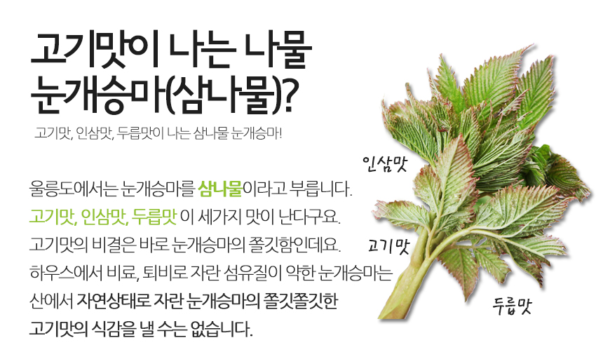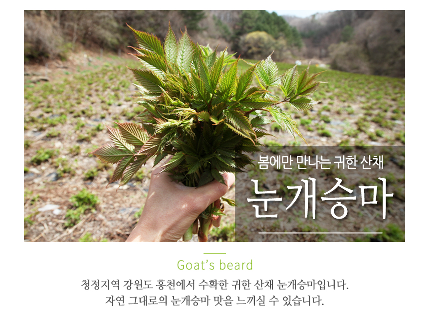 - 강원도 홍천 청정지역에서 자란 맛있는 눈개승마 / 해발 600m 고랭지에서 자라 연하고 부드러워요!