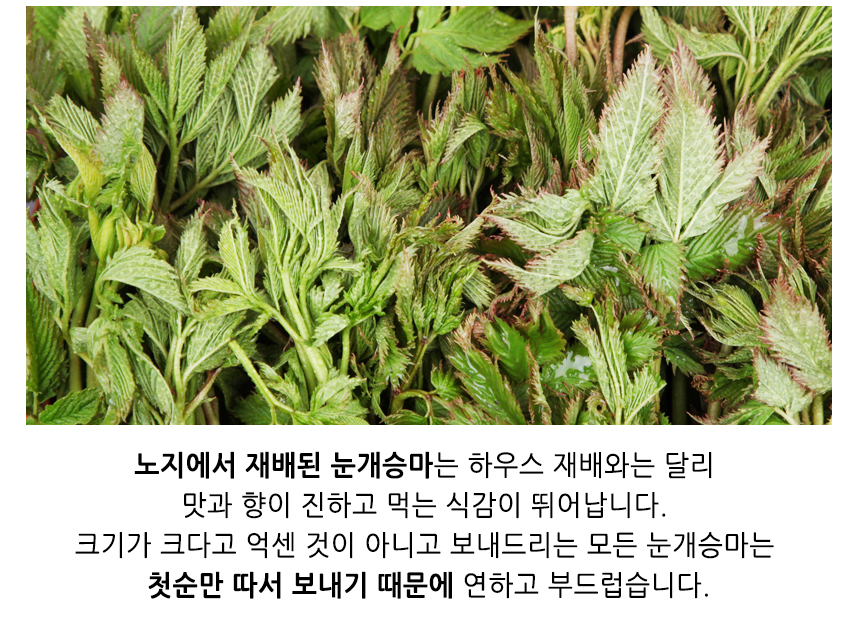 - 강원도 홍천 청정지역에서 자란 맛있는 눈개승마 / 해발 600m 고랭지에서 자라 연하고 부드러워요!