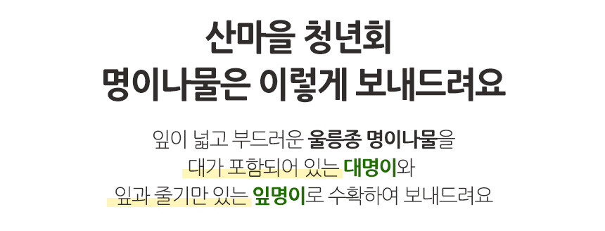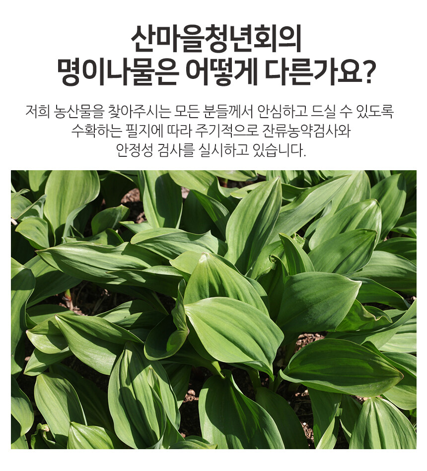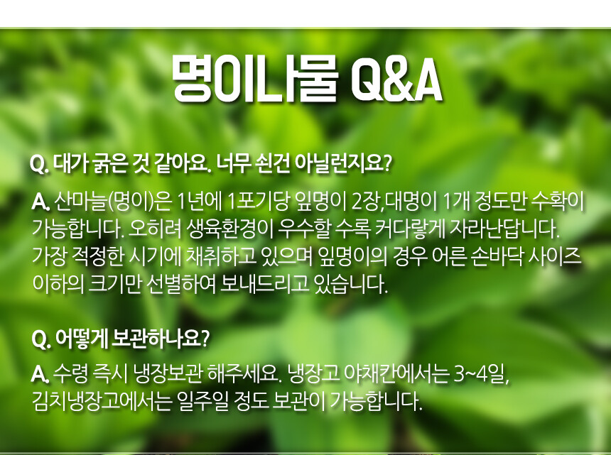 - 강원도 홍천 청정지역에서 자란 맛있는 명이나물 / 해발 600m 고랭지에서 자라 연하고 부드러워요!